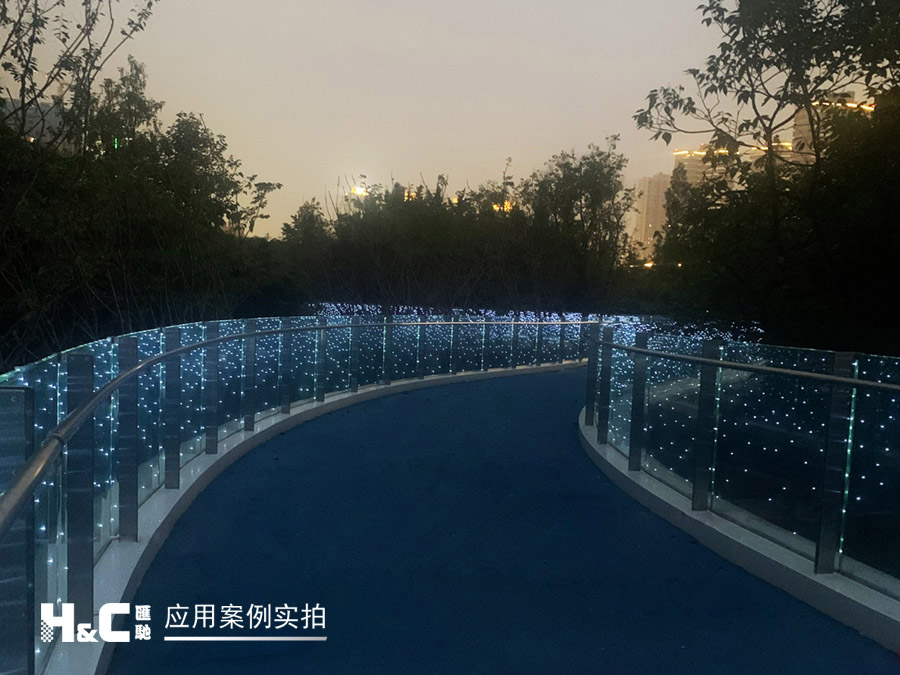 “絲路云錦”有三條跨線橋,外形設(shè)計靈感來源于“竹葉輕”,其中一座橋上的護(hù)欄采用了匯馳LED發(fā)光玻璃。它將單個LED點光源封裝在兩片鋼化安全玻璃中間,并使用隱線工藝,不細(xì)看基本看不到線路,這樣既保持了玻璃的透明特性,又可以控制呈現(xiàn)光電效果,創(chuàng)造出美妙的空間,起到獨特的裝飾和調(diào)節(jié)場景氛圍的作用。