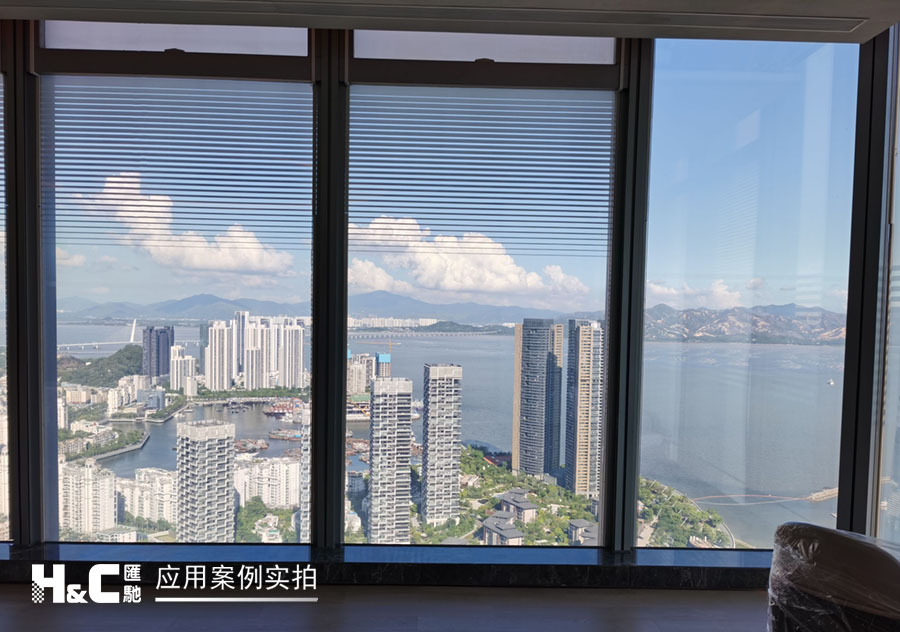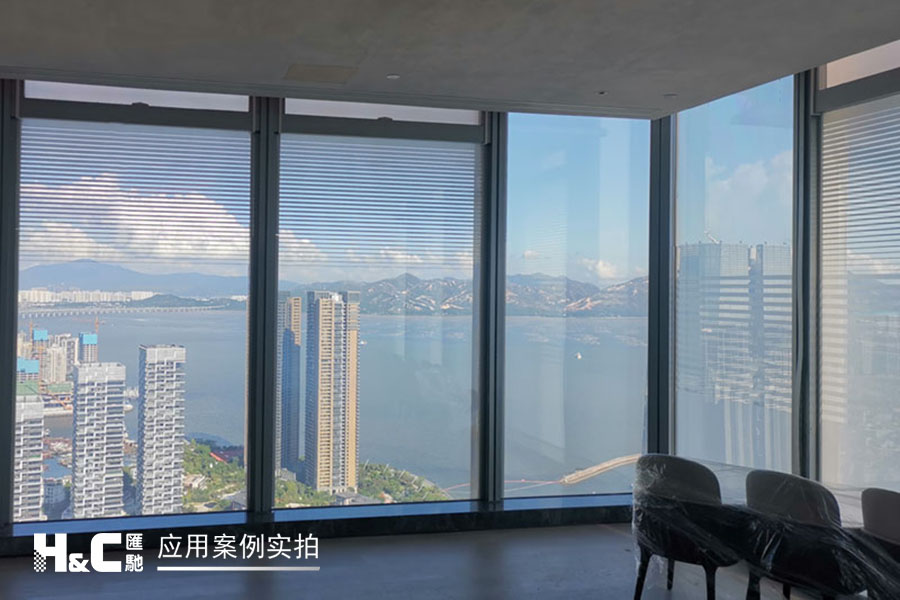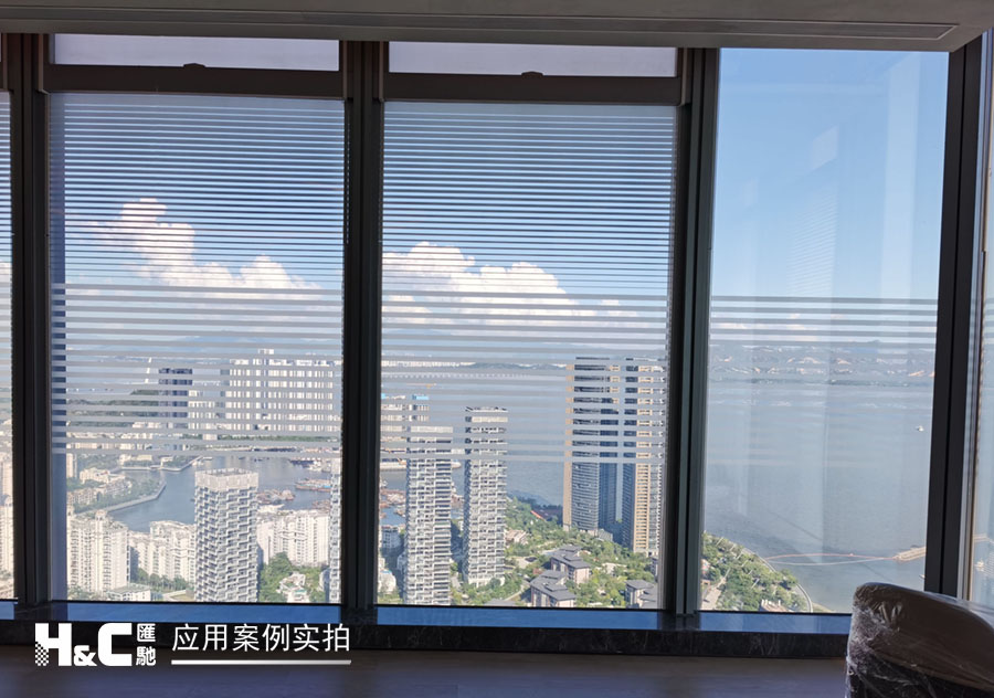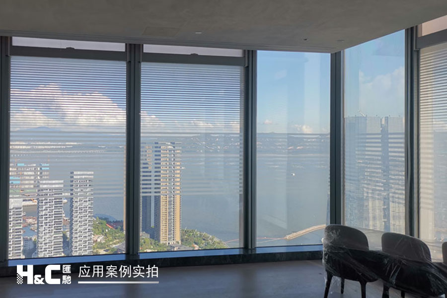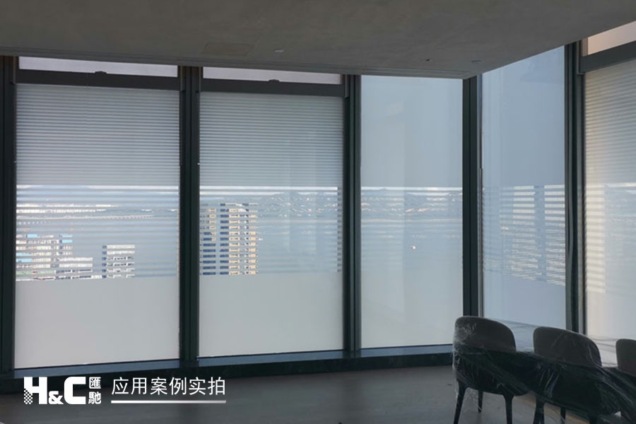 外立面的玻璃采光極好,但有時(shí)室外復(fù)雜的光線也會(huì)對(duì)室內(nèi)造成困擾。本案業(yè)主采用了廣州匯馳實(shí)業(yè)提供的百葉調(diào)光膜,貼在玻璃內(nèi)表面,讓普通玻璃變成調(diào)光玻璃。百葉的變化效果可以用遙控調(diào)控,有效控制光線的進(jìn)入,讓玻璃變得更有科技感。